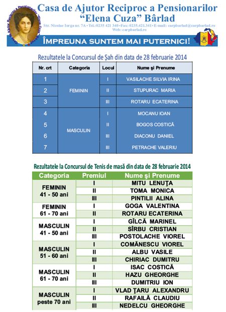 Rezultatele la Concursul de Șah din 28 februarie 2014