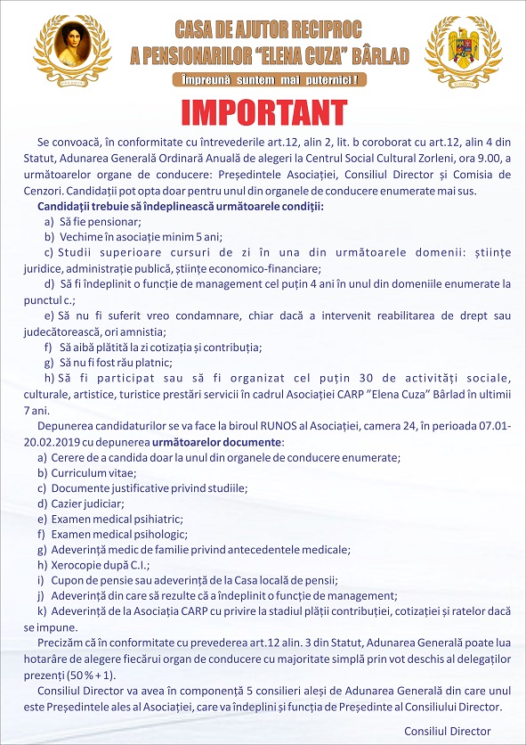 Asociația Casa de Ajutor Reciproc a Pensionarilor ,,Elena Cuza’’ din Bârlad, din dorința de a asigura contactul direct cu legiuitorii în ceea ce privește problemele vârstei a treia, a organizat o conferință în jurul situației pensiilor. Invitații, deputatul Marius Budăi Constantin, fostul Ministru al Muncii și Justiției Sociale și deputatul Adrian Solomon, președintele Comisiei pentru Muncă și Protecție Socială, au stat la dispoziția publicului pentru a clarifica toate problemele legate de pensii și pentru a lămuri care vor fi viitoarele modificări ce vor influența calcularea lor. Din caza unor probleme apărute în ultimul moment, economistul Robu Vasilică – Director la Casa Națională de Pensii și Georgică Bădărău - Secretarul General al Federației Naționale „Omenia” nu au putut fi pre...
