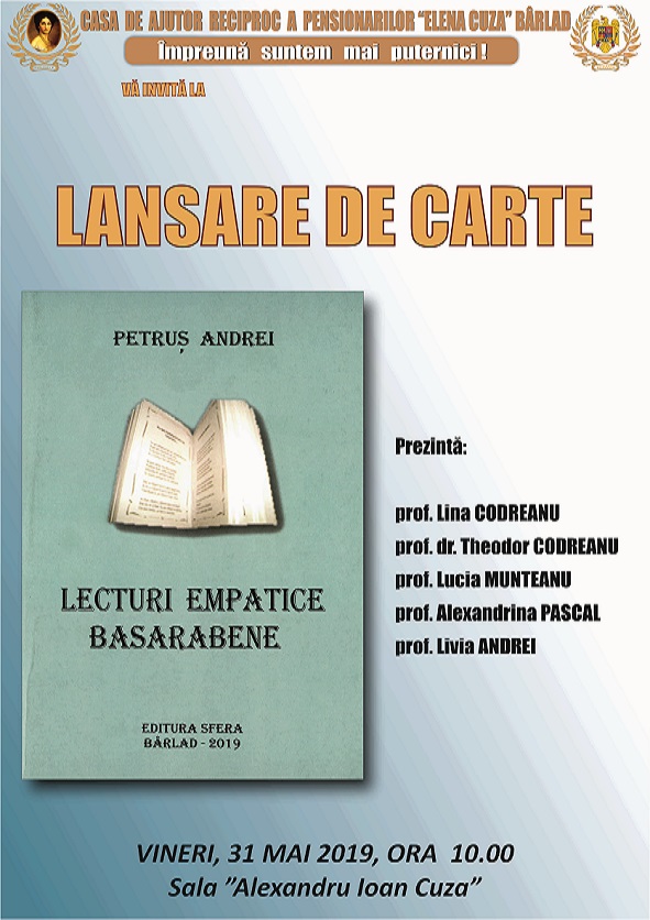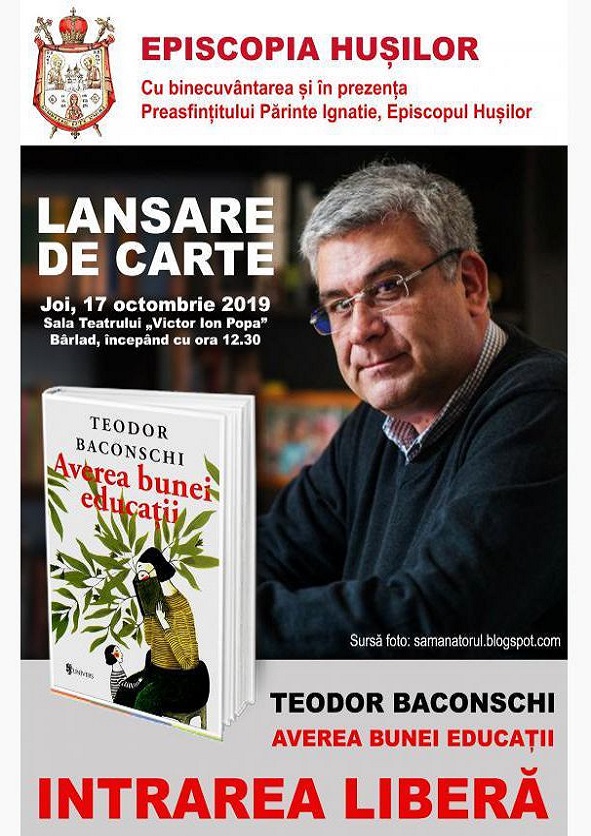 ...Joi, 17 octombrie 2019, Bârladul a fost gazda unui eveniment cultural deosebit ce l-a avut în prim plan pe domnul Teodor Baconschi, antropolog religios, diplomat, teolog și politician român. Acesta a lansat cartea ,,Averea bunei educații’’, lucrare în care dumnealui expune puncte pertinente de vedere despre ceea ce înseamnă educația potrivită a copiilor. Putem deduce astfel că opera este menită să vină în special în ajutorul părinților. Deoarece viziunea autorului este în perfect acord cu educația creștin ortodoxă, evenimentul s-a desfășurat cu binecuvântarea Preasfințitului Ignatie, Episcopul Hușilor, astfel activitatea transformându-se într-o consfătuire despre societate și educație. Asociația Casa de Ajutor Reciproc a Pensionarilor ,,Elena Cuza’’ Bârlad, a fost reprezentată de domnul președinte Mihai Nicolaie. Acesta, profitând de bucuria revederii Episcopului și de prezența...