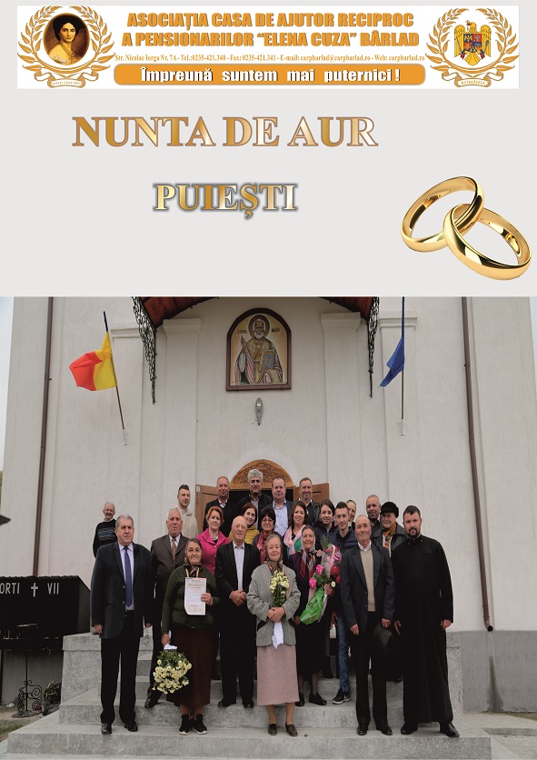 Duminică, 20 octombrie 2019, la biserica cu hramurile „Sf. Nicolaie” și „Sf. Cuvios Visarion Sarai” din localitatea Puiești, județul Vaslui, Asociația Casa de Ajutor Reciproc a Pensionarilor „Elena Cuza” din Bârlad și-a sărbătorit cuplurile membre care au împlinit 50 de ani de la căsătorie. Președintele Casei, Mihai Nicolaie împreună cu Responsabilul Sucursalei Puiești, Eugen Radu au fost nașii celor 6 cupluri aniversate. Slujba religioasă a fost oficiată de părintele paroh Alexandru Vasile și de dascălul Gheorghe Cucu. La final, din partea Asociației s-au acordat diplome aniversare, medalii și câte un ajutor nerambursabil în valoare de 50 de ron. Cuplurile sărbătorite anul acesta: