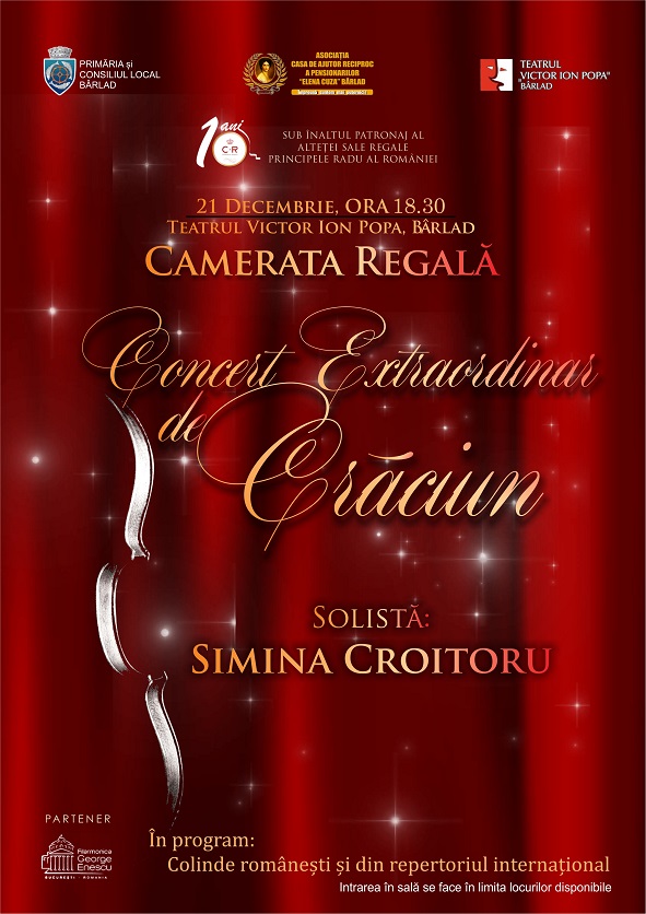 Casa de Ajutor Reciproc a Pensionarilor ,,Elena Cuza’’ din Bârlad, Primăria și Consiliul Local Bârlad și Teatrul ,,Victor Ion Popa’’ au reușit să facă un gest deosebit în întâmpinarea sărbătorile de iarnă, anume aducerea la Bârlad a Cameratei Regale.