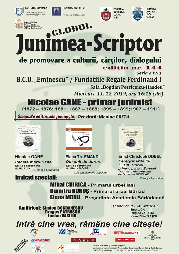 Organizat de Clubul Junimea-Scriptor, evenimentul a avut ca scop promovarea culturii și dialogul între oamenii cărților din orașele Iași și Bârlad. Invitații speciali ai activității au fost primarul Bârladului, avocat Dumitru Boroș și doamna profesor Elena Monu, Președinta Academiei Bârlădene. Au luat cuvântul Ioan Buftea, Nicolae Crețu, Vlad Nicolaie Nedelcu, Simion Bogdănescu, Dragoș Pătrașcu, Lucian Vasiliu și membrul de onoare al Casei de Ajutor Reciproc a Pensionarilor ,,Elena Cuza’’ din Bârlad- profesorul Gruia Novac. Mai amintim că au participat și viceprimarul municipiului Bârlad- profesor Roxana Miron Feraru, doamna doctor Tiron Cristina și președintele Casei de Ajutor Reciproc a Pensionarilor ,,Elena Cuza’’ din Bârlad- magistrat pensionar Nicolaie Mihai, personalități bine cunoscute pentru iubirea și aprecierea ce le poartă literaturii, culturii și valorilor tradiționale. În acest context s-au...