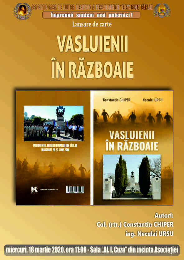 Patrimoniul bibliofil al județului Vaslui se îmbogățește zilele acestea cu o inedită lucrare documentar-omagială, ce se va prezenta la Asociația Casa de Ajutor Reciproc a Pensionarilor „Elena Cuza” Bârlad în data de 18 martie 2020. Editată sub auspiciile Asociației Naționale Cultul Eroilor ”Regina Maria” și Societatea Culturală București-Chișinău, cartea ”Vasluienii în războaie” este dedicată comemorării și omagierii eroilor și participanților la războaiele românilor, pentru realizarea și apărarea statului unitar național român în cele 3 etape definitorii: