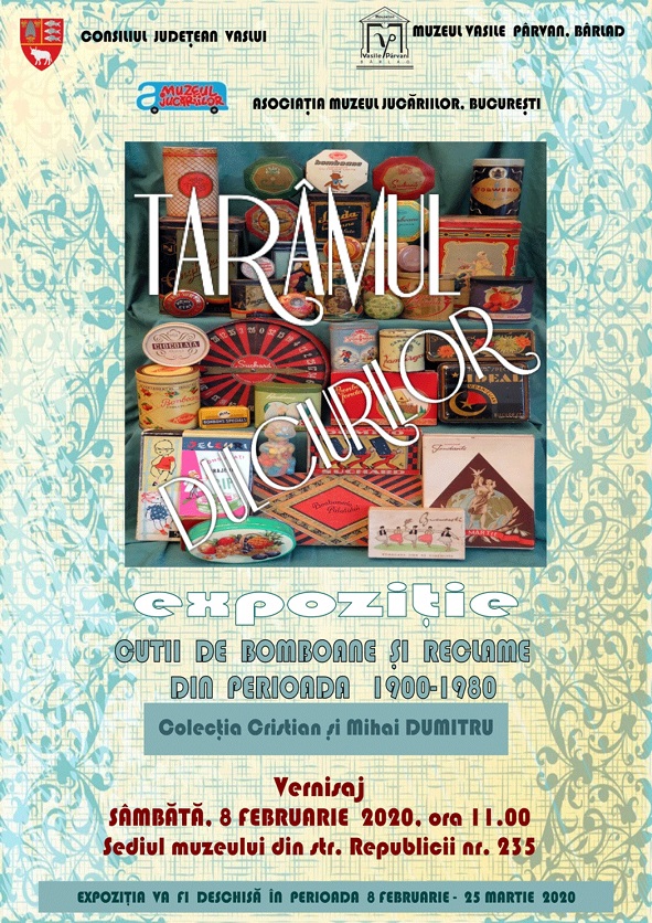 Consiliul Județean Vaslui, Muzeul “Vasile Pârvan”, Bârlad și Asociația Muzeul Jucăriilor, București vă invită sâmbătă, 8 februarie 2020, ora 11.00, la vernisajul expoziției “TÄ‚RÂMUL DULCIURILOR - cutii de bomboane și reclame din perioada 1900-1980”. Evenimentul va avea loc la sediul muzeului din strada Republicii nr. 235.