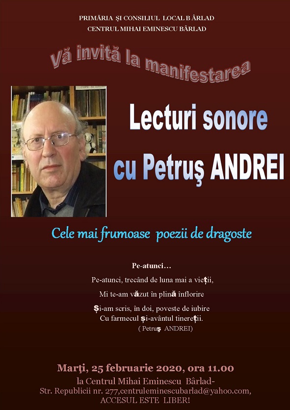 Renumitul poet vasluian Petruș Andrei, membru al Uniunii Scriitorilor din România, își va lansa cea de-a 31-a carte – Tinerețea fără bătrânețe a lui MIHAI EMINESCU și viața sa fără de moarte, într-o ediție alcătuită de „Jumătatea mai Bună” a acestuia – Livia Andrei și tipărită la editura „Sfera” din Bârlad. Lucrarea cuprinde studii, eseuri și poezii referitoare la viața și opera lui Mihai Eminescu, la eminescologi.