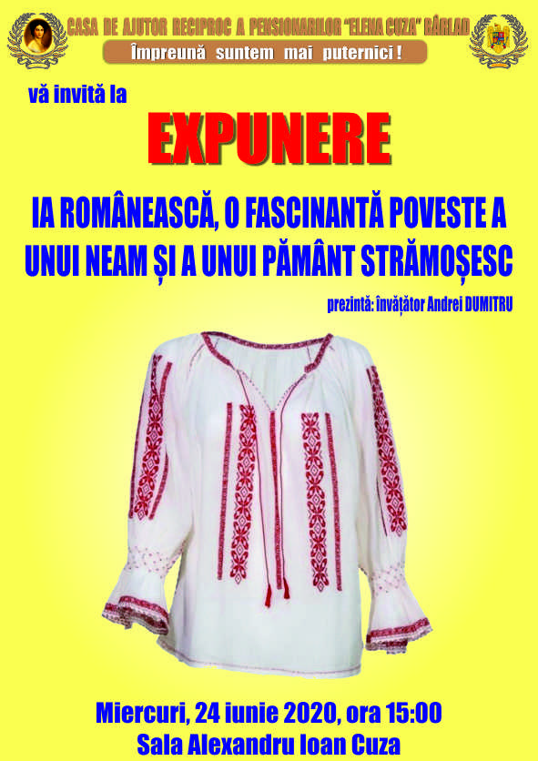 Miercuri, 24 iunie 2020, începând cu ora 15.00, sala „Alexandru Ioan Cuza” din incinta Asociației Casa de Ajutor Reciproc a Pensionarilor „Elena Cuza” din Bârlad, va găzdui expunerea „Ia românească, o fascinantă poveste a unui neam și a unui pământ strămoșesc”, prezentată de domnul învățător Dumitru Andrei. Pe 24 iunie este sărbătorită ia: este Ziua internațională a Iei începând din 2013, la inițiativa comunității online „La Blouse Roumaine”.