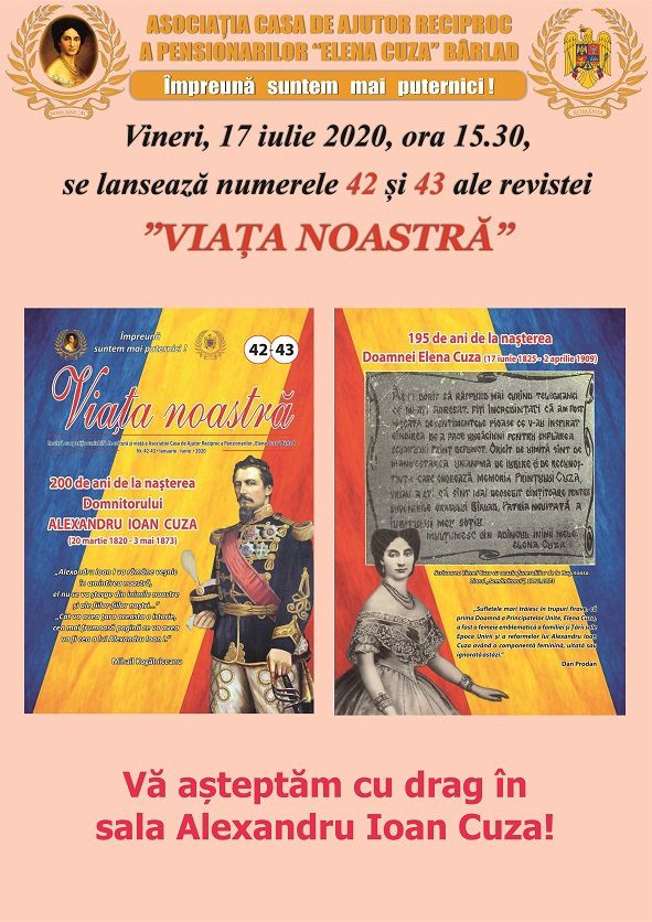 Vineri, 17 iulie 2020, în Sala „Alexandru Ioan Cuza” din incinta Asociației Casa de Ajutor Reciproc a Pensionarilor „Elena Cuza” din Bârlad s-a lansat revista cu numerele 42-43 - „Viața Noastră”.