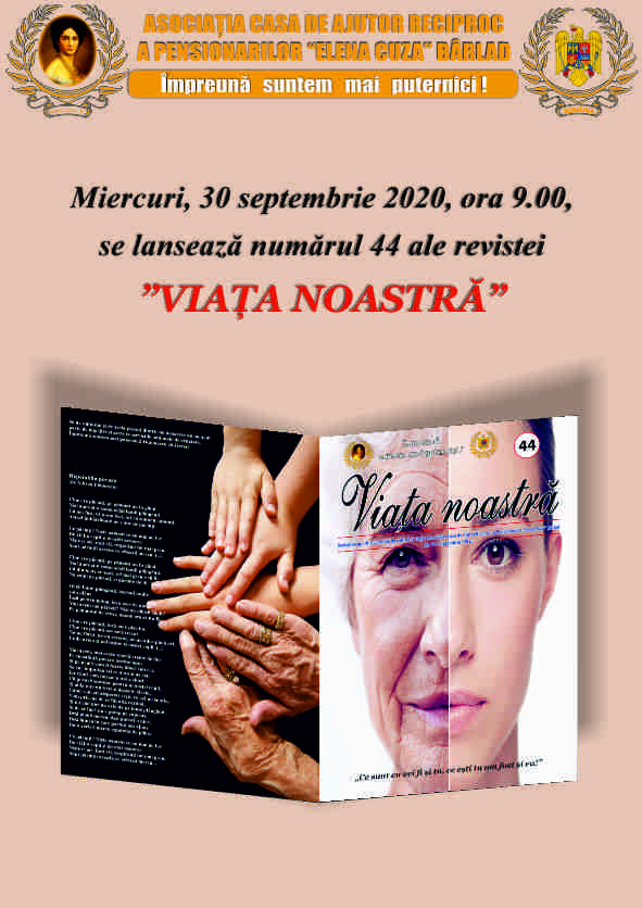 Miercuri, 30 septembrie 2020, în incinta Asociației Casa de Ajutor Reciproc a Pensionarilor „Elena Cuza” din Bârlad, s-a lansat numărul 44 al revistei „Viața Noastră”, număr prin care „Casa” noastră își arată recunoștința și prețuirea față de persoanele de vârsta a 3-a.