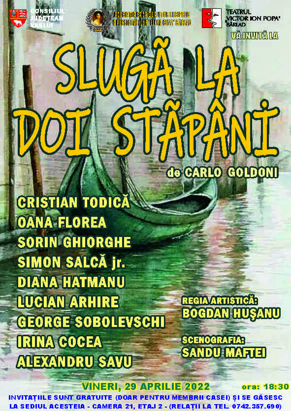 Cum ajungi să servești doi stăpâni în același timp? Câtă vreme va trece până-și vor da seama stăpânii? Ce se va întâmpla, dacă-și vor da seama? Să nu ne grăbim cu răspunsurile, pentru că Goldoni a scris acest text în urmă cu aproape trei sute de ani. Altfel funcționa pe atunci facebook-ul și altele erau relațiile dintre oameni și dintre clasele sociale. Spus în două feluri, mai simplu sau mai elevat, Slugă la doi stăpâni, e un text despre șmecheria omului simplu sau o poveste despre cum să complici cu seninătate o situație ce ține de cerințele umane cotidiene.