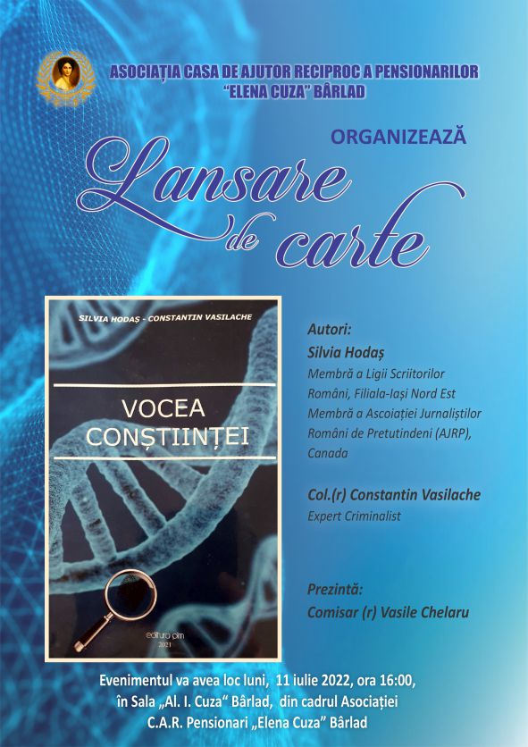 ASOCIAȚIA CASA DE AJUTOR RECIPROC A PENSIONARILOR ”ELENA CUZA” BÂRLAD OFERĂ‚ MEMBRILOR ȘI IUBITORILOR DE LECTURĂ‚ O ÎNTÂLNIRE CU DOAMNA SILVIA HODAȘ ȘI COLONELUL ( R ) CONSTANTIN VASILACHE, AUTORI AI ROMANULUI POLIȚIST ”VOCEA CONȘTIINÈšEI”.
