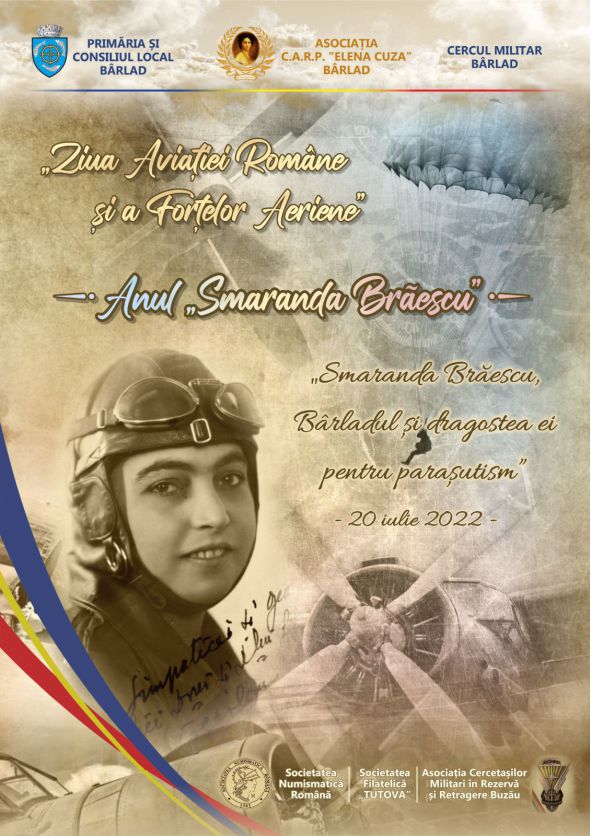 Asociația Casa de Ajutor Reciproc a Pensionarilor „Elena Cuza” Bârlad, împreună cu Primăria și Consiliul Local Bârlad, Cercul Militar Bârlad, Societatea Numismatică Română, Asociația Cercetașilor Militari în Rezervă și Retragere Buzău și Societatea Filatelică Tutova, cu ocazia „Zilei Armatei Române și a Forțelor Aeriene”, în Anul „Smarandei Brăescu”, organizează manifestarea „Smaranda Brăescu, Bârladul și dragostea ei pentru parașutism”, manifestare dedicată primei femei parașutist cu brevet din România, CAMPIOANÄ‚ MONDIALÄ‚ și EUROPEANÄ‚, care va avea loc miercuri, 20 iulie 2022, începând cu ora 11.00, la bustul Smarandei Brăescu, amplasat în Parcul Teatrului ”V. I. Popa” din Bârlad, unde va avea loc o depunere de coroane din partea oficialităților locale și centrale. Ulterior, de la 11.30, la Cercul Militar Bârlad, va fi vernisată o expoziție de medalistică, filatelie, cartofilie, machete aviație, para...