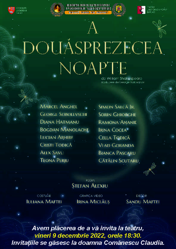 În acest text, ca, de altfel, și în celelalte piese ale lui Shakespeare, cuvintele scrise, spuse sau cântate au puteri uriașe - unesc, insultă, defăimează sau rănesc. Prezența morții fascinează (ea învăluie personajele de la început: Olivia își plânge fratele mort, Viola suferă pentru că își crede fratele dispărut în naufragiu, Orsino vrea să-și ”omoare” dorul, Feste crede că viața trece prea repede...), însă iubirea este cea care se opune acestui context al morții - toate personajele principale din piesă sunt îndrăgostite, își caută perechea, fac curte voalat sau deschis, agresiv sau domol, simplu sau cu pasiune: Viola e delicată, Olivia agresivă, Malvolio stupid, iar Orsino infatuat. Liantul între cele două - moartea și iubirea - este muzica: ea este cea care alină dorul personajelor și îi ajută să își exprime melancolia. Vizionare plăcută!
