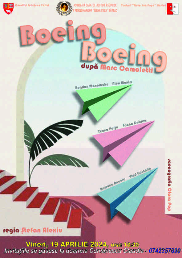 Avionul Boeing aterizează, din nou, Vineri - 19 aprilie, la ora 18,30 la Teatrul V.I.Popa din Bârlad și vă așteaptă să vă umpleți bagajele cu talentul, frumusețea și energia celor șase actori: Bogdan Manolache, Teona Perju, Vlad Goranda, Alexandru Maxim, Ioana Dobrea și Ramona Ananie. Regia: Ștefan Alexiu Scenografia: Clara Pop Vă așteptăm cu drag!