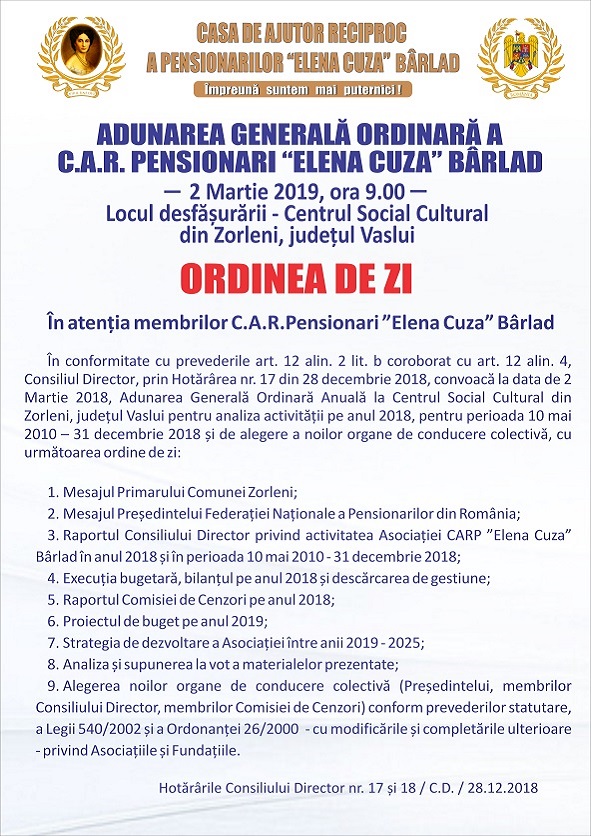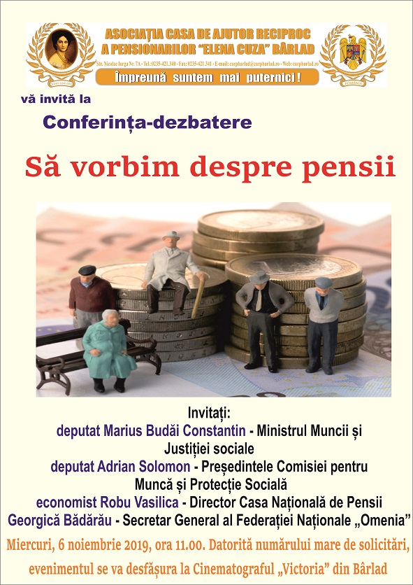 Asociația Casa de Ajutor Reciproc a Pensionarilor ,,Elena Cuza’’ din Bârlad, din dorința de a asigura contactul direct cu legiuitorii în ceea ce privește problemele vârstei a treia, a organizat o conferință în jurul situației pensiilor. Invitații, deputatul Marius Budăi Constantin, fostul Ministru al Muncii și Justiției Sociale și deputatul Adrian Solomon, președintele Comisiei pentru Muncă și Protecție Socială, au stat la dispoziția publicului pentru a clarifica toate problemele legate de pensii și pentru a lămuri care vor fi viitoarele modificări ce vor influența calcularea lor. Din caza unor probleme apărute în ultimul moment, economistul Robu Vasilică – Director la Casa Națională de Pensii și Georgică Bădărău - Secretarul General al Federației Naționale „Omenia” nu au putut fi pre...