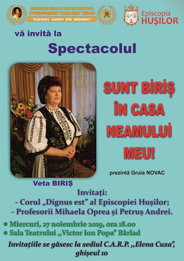 La sfârșitul anotimpului de toamnă, în data de 27 noiembrie, într-o zi de miercuri, Asociația Casa de Ajutor Reciproc a Pensionarilor ,,Elena Cuza’’ din Bârlad, împreună cu Episcopia Hușilor, a organizat o întâlnire de suflet ce a avut-o în prim plan pe interpreta de muzică populară Veta Biriș. Este vorba despre un spectacol în cinstea tradițiilor românești, în cinstea zestrei noastre culturale, cu ocazia sărbătoririi Zilei Naționale a României.