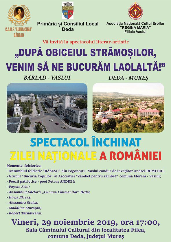 Cu ocazia zilei de 1 decembrie, Casa de Ajutor Reciproc a Pensionarilor ,,Elena Cuza’’ din Bârlad, Primăria și Consiliul Local Deda și Asoci...