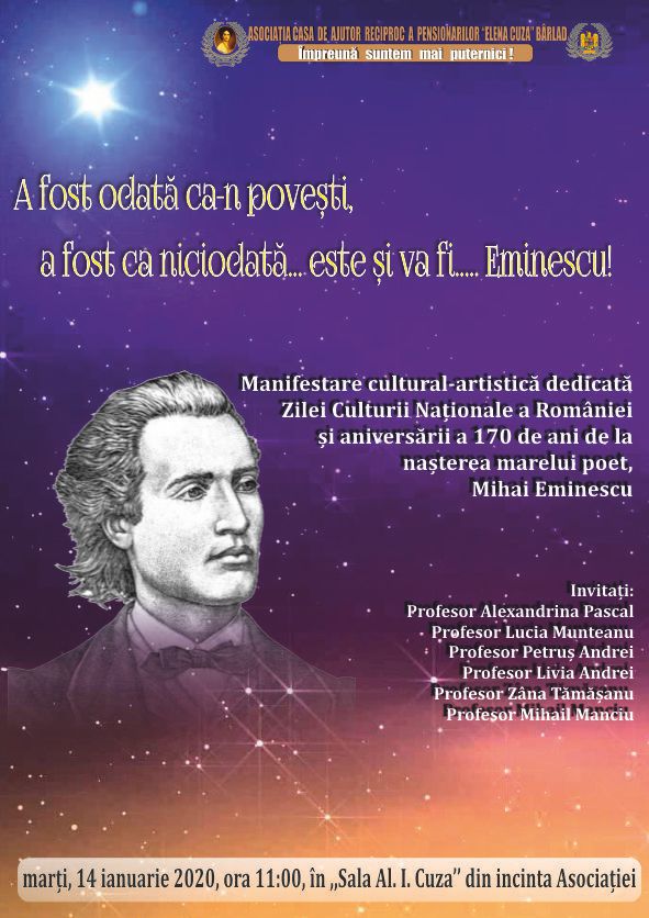 Asociația Casa de Ajutor Reciproc a Pensionarilor ,,Elena Cuza’’ a organizat manifestarea cultural-artistică intitulată: ,,A fost odată ca-n povești, a fost ca niciodată...este și va fi ...Eminescu!’’. Ne-am propus astfel să dedicăm ziua de 14 ianuarie sărbătoririi cifrei rotunde de 170 de ani de la nașterea poetului nepereche, Mihai Eminescu.