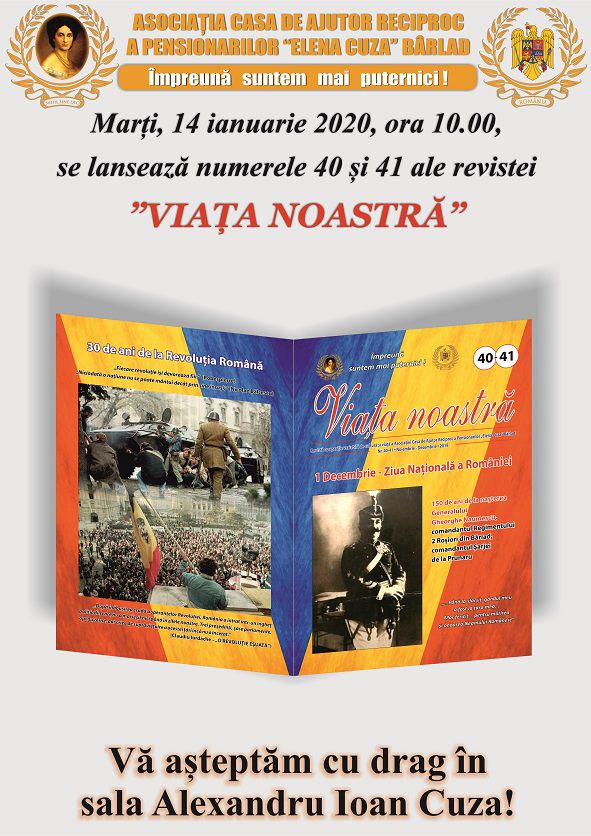 Vineri, 17 iulie 2020, în Sala „Alexandru Ioan Cuza” din incinta Asociației Casa de Ajutor Reciproc a Pensionarilor „Elena Cuza” din Bârlad s-a lansat revista cu numerele 42-43 - „Viața Noastră”.