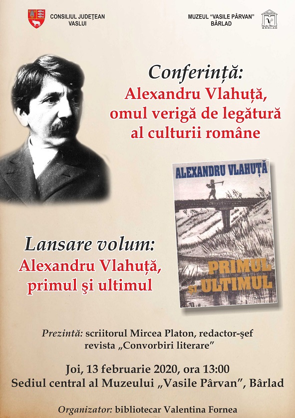 Muzeul „Vasile Pârvan”, Bârlad organizează joi, 13 februarie 2020, conferința „Alexandru Vlahuță, omul verigă de legătură al culturii române” susținută de scriitorul Mircea Platon și lansarea celui mai recent volum al acestuia, sub titlul „Alexandru Vlahuță, primul și ultimul”.