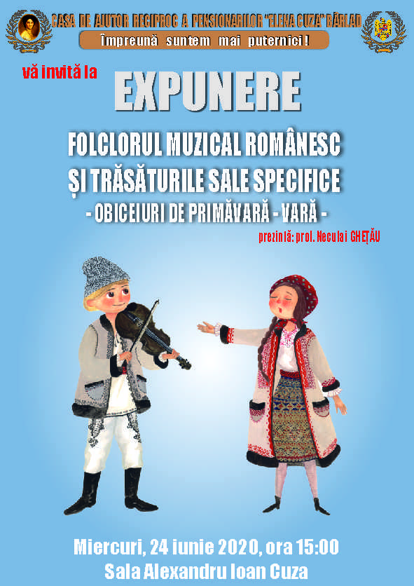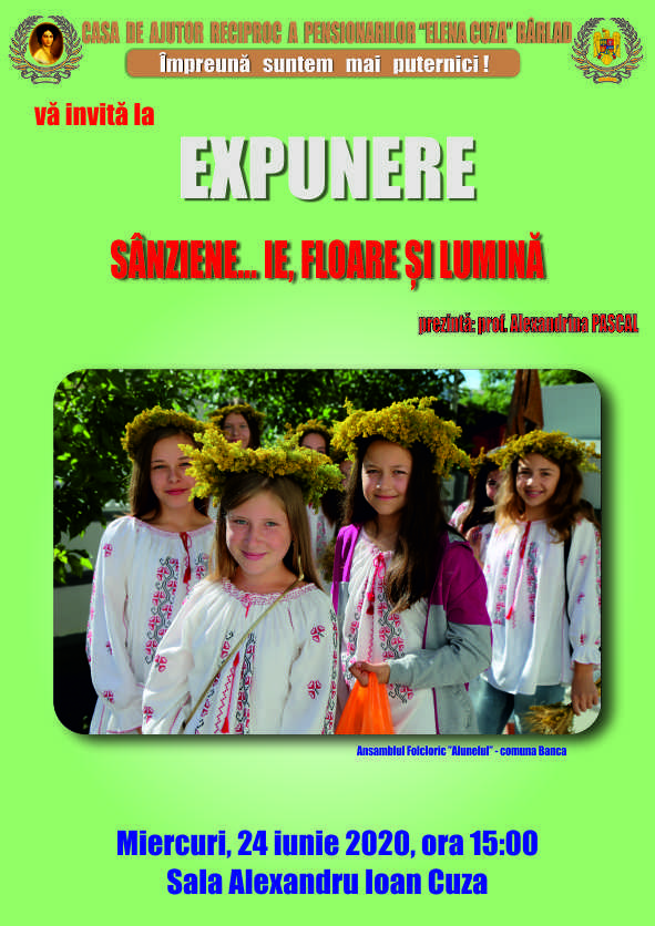 Miercuri, 24 iunie 2020, începând cu ora 15.00, în sala „Alexandru Ioan Cuza” din incinta Asociației Casa de Ajutor Reciproc a Pensionarilor „Elena Cuza” din Bârlad, va avea loc expunerea „Sânziene…ie, floare și lumină”, prezentată de doamna profesor Alexandrina Pascal. Sărbătoarea din 24 iunie mai este cunoscută în popor sub numele de „Sânziene” sau „Drăgaica”. Tot acum, Biserica Ortodoxă face pomenirea Nașterii Sfântului Ioan Botezătorul.