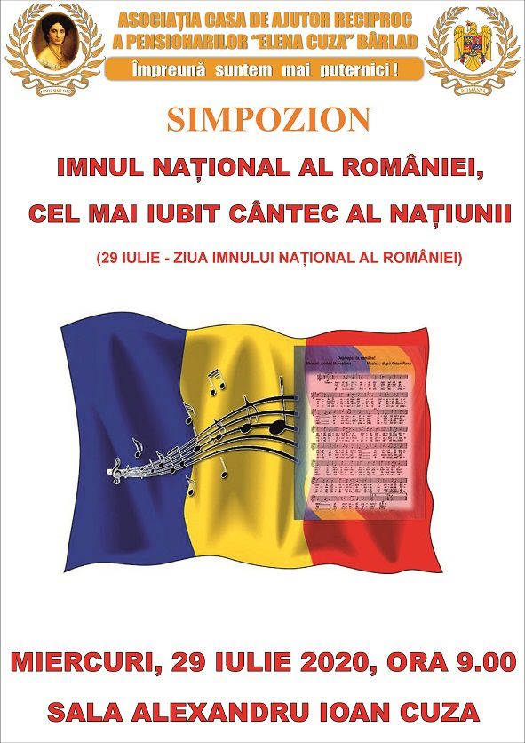 Miercuri, 29 Iulie, cu ocazia Zilei Imnului Național al României, Asociația Casa de Ajutor Reciproc a Pensionarilor „Elena Cuza” din Bârlad a organizat simpozionul „IMNUL NAȚIONAL AL ROMÂNIEI, CEL MAI IUBIT CÂNTEC AL NAȚIUNII”, desfășurat în Sala Alexandru Ioan Cuza, cu respectarea normelor de igienă și distanțare impuse de Starea de Alertă.