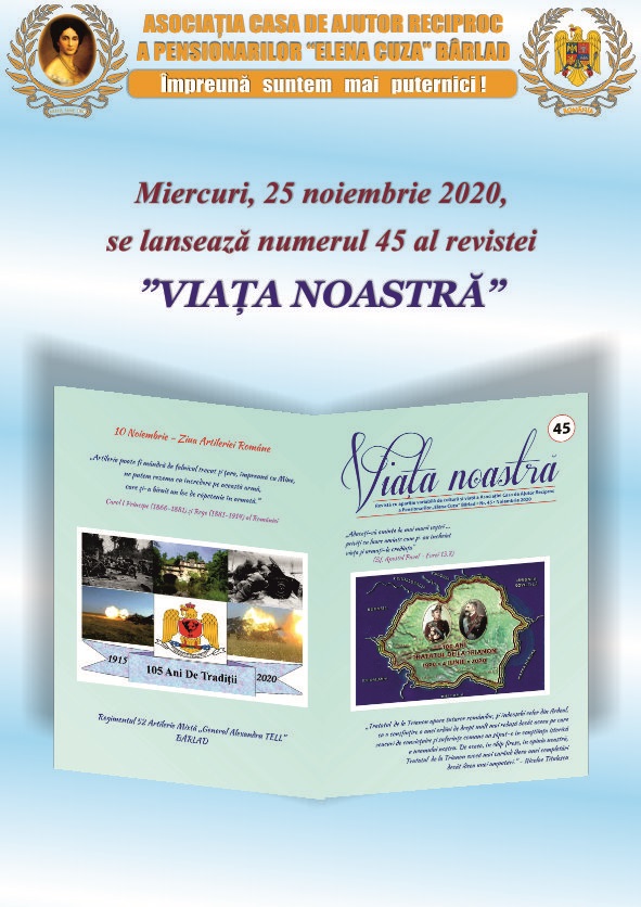 Miercuri, 25 noiembrie 2020, s-a lansat nr. 45 al revistei „Viața Noastră”, un număr cu nu conținut bogat din domenii ca: istorie, literatură, religie, pictură, muzică, medicină, gastronomie etc. Revista se poate procura de la sediul Asociației Casa de Ajutor Reciproc a Pensionarilor „Elena Cuza” din Bârlad. Vă dorim lectură plăcută!