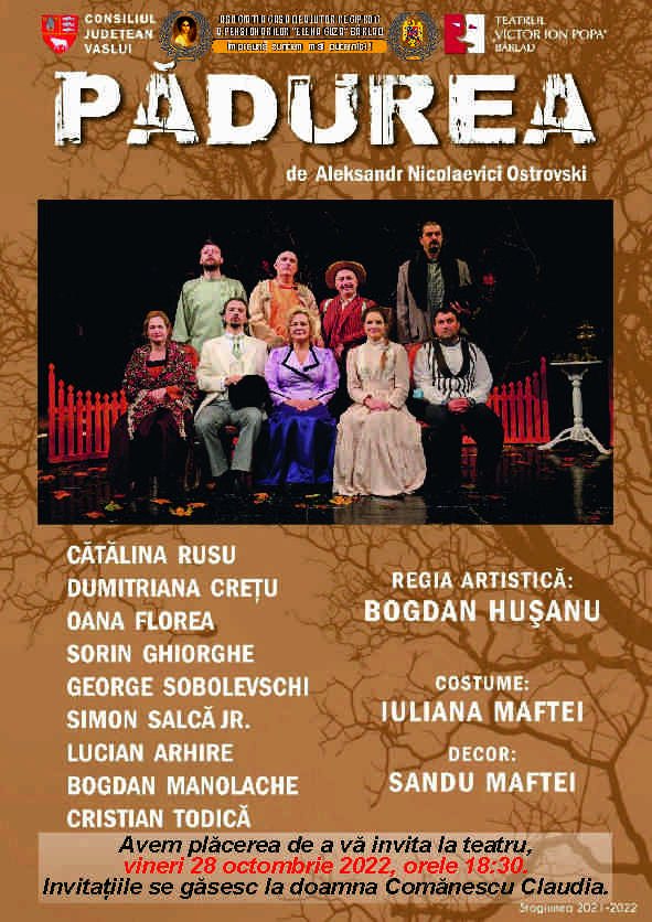 E un titlu banal (probabil) pentru o piesă extraordinară (fără îndoială)! Pădurea, cu zeci de fațete (misterioasă, amenințătoare, piedică în calea agriculturii, sursă de lemn și vânat, spațiu de refugiu în calea cotropitorilor sau a tehnologiei...), a fost cutreierată, admirată, tăiată sau arsă, însă rareori ocrotită cu-adevărat... Ca sursă de inspirație, pădurea a avut ceva de oferit, cu generozitate, și artiștilor... În PĂDUREA lui Ostrovschi, întâlnim trei dintre cele mai dorite lucruri din viața unui om: arta, banii și iubirea (le-am pus alfabetic, să nu se supere...).