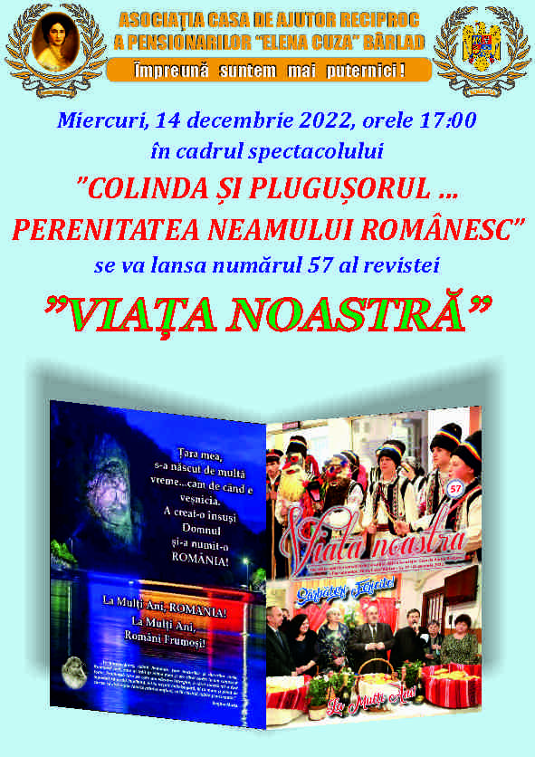 Miercuri, 14 decembrie 2022, începând cu ora 17.00, în cadrul spectacolului „Colinda și Plugușorul...Perenitatea Neamului Românesc”, va avea loc lansarea celui de-al 57-lea număr al revistei „Viața Noastră”, număr dedicat anotimpului de iarnă și sărbătorilor sale.