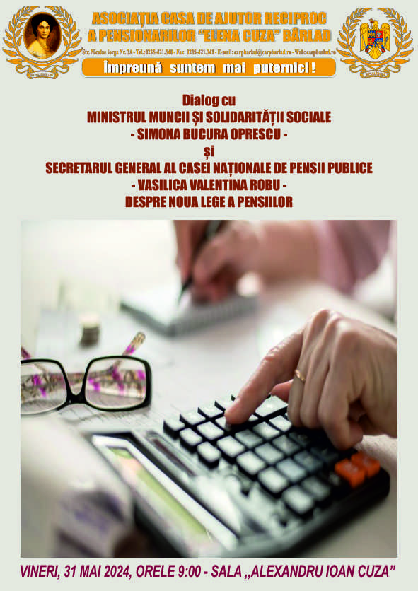 Vineri, 31 mai 2024, Asociația noastră a fost onorată de vizita Ministrului Muncii și Solidarității Sociale - Simona Bucura Oprescu și a Secretarului General al Casei Naționale de Pensii Publice - Vasilica Valentina Robu, care au purtat un dialog cu membrii Casei despre NOUA LEGE A PENSIILOR.