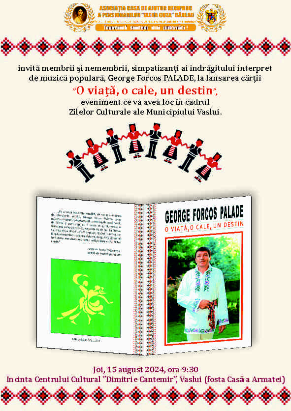 Asociația Casa de Ajutor Reciproc a Pensionarilor ”Elena Cuza” Bârlad invită membrii și nemembrii, simpatizanți ai indrăgitului interpret de muzică populară, George Forcos PALADE, la lansarea cărții ”O viață, o cale, un destin”, eveniment ce va avea loc în cadrul Zilelor Culturale ale Municipiului Vaslui.