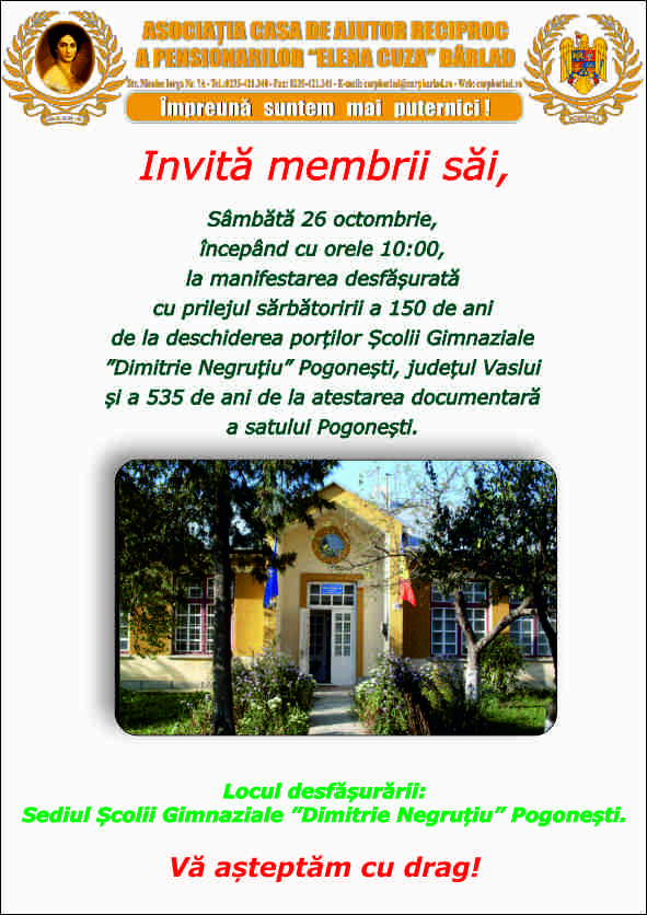 150 de ani de la deschiderea porților Școlii Gimnaziale ”Dimitrie Negruțiu” Pogonești, județul Vaslui